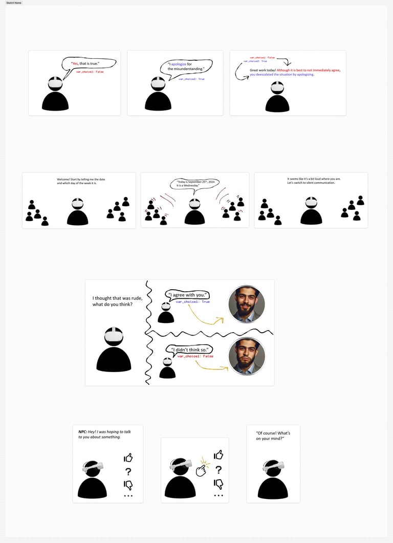 Flowchart of events, interactions, and dialogue for communication soft skill training prototype tutorial and experience